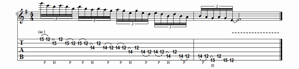All right and then from there we’re gonna slide up from nowhere up to the seventh fret of the low E and then hammer to nine and then to seven on the A string, so… then follow that with the open E. All right, so since this is in the key of E and it’s a 1-4-5 progression. So we’ve got our one chord, which is E, so we’re using this E9 chord here like the Hendrix chord. So I’m on the seventh fret of the A string with my second finger and the sixth through the sixth fret of the D string with my first finger, seventh fret of the G string with my third finger and seventh fret of the B string with my fourth finger… All right and then each time after we strum the chord we’re going to do it again, but it’s the same notes but it’s going to be different, so the first time we slide up to them and do a hammer-on… and then from there with your second finger reach up and grab the 7 on the low E and slide to nine and then pick up that seventh fret of the A string and then the open E… and then just do that nine… So you do that sequence four times and then at the end of it we do that so we do the pick seven slide to nine on the low E to the seven on the A string and then we follow that with the open A string because now we’re going to the four chord which would be an A in this case; we’re doing A7, but we’re going to do a different voicing. So what I’m doing here is you’re just going to take your first finger and just bar it across the first five strings at the fifth fret and put your second finger on the sixth fret of the G string… Now we’re gonna do that same riff that we did before but instead of being on the low E, seven slide to nine and then 7 on the A, we’re gonna do the same thing but on the A and the D strings; so seventh fret of the A string, slide to nine to the seventh fret of the D string and then the open A… then back to the one chord twice. Now we’re going to go to our five chord, which is B7… so we do those little pickup notes and then to D7 to the A7 and then that little riff and then the turn around again like we did at the beginning and then the whole thing would just repeat. All right, there at the end there I just messed up when I went to the A7. It should have gone back to the turnaround but I did it where it is on the A. Now if you end up doing that it’s not it’s not a huge deal. The notes are still in key, it just doesn’t lead it exactly the way you want it to. Anyway that’s basically all the parts. So what you could do with this to kind of make it your own is just to change up the rhythm a little bit. So on the chords I’m play like one and two, so you could change that rhythm up anyway you want just long as everything still lines up the way that it should.