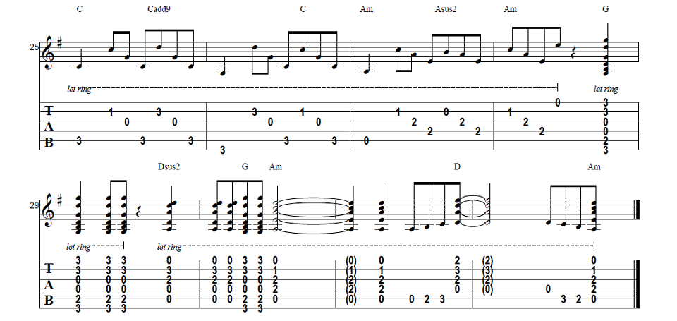 Okay now this is where the next big change is. So this last phrase was probably the shortest one… so there on measure 22 we hit the first fret of the B string there on the and of three and then on the downbeat of four it’s the A string open four, the and of four is the second fret and then to the open D string. Okay so now we’re going to go to A, D voicing, but it’s not like this D voicing… it’s actually like a power chord, it’s a D5. So this transition we’re going to come up to that, so what we’re going to do is we’re going to come up and put our first finger on to the third fret of the B string and we’re going to put our third finger onto the fifth fret of the high E string. So now we’re going to pick the open D string on beat one of measure 23 and then on the downbeat of two it’s the high E string, and of two is the B string, back to the D again on the downbeat of three; so it’s like one, two and, three and, four and… Then on the next measure what we’re going to do is we’re just going to take our first finger and we’re going to lay it down flat so it’s going across the third fret of the high E string and the B string and same picking E, B, open D string and then the chord is going to change again and now we’re going to put our second finger onto the third fret of the B string and our first finger on the second fret of the high E string… and then that little chromatic two, one, open again. So let’s just play that whole phrase. So we’re starting at the last part of, let’s see measure 20. So I start with that little chromatic movement so I’m on the second fret of the D string with my second finger to the first fret to the open string to the C, Cadd9, that G bass note on the third fret of the low E string, move it back… and now we have to make that jump up to this chord… and then back to that again. So that part is really weird, especially when you play this part by yourself. If you’re playing it slower that chromatic part just sounds really weird, when it’s up to tempo, it comes by really quick so you don’t notice it as much, but it does sound kind of weird. All right so back to a C, Cadd9, bass note to G and move it back to the C, Am, Asus2, Am. All right, so that is the actually the end of where they’re arpeggiating and then it goes into some strumming at that point.