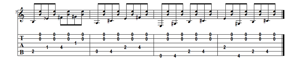 All right so the next one I want to look at is a walking bass line, but we’re gonna be playing it on guitar. So it’s entirely made up of eighth notes and the bass line notes will be on all of the down beats, so on one two three four and then on the ands, the off beats, we’re going to just play the B and E strings open; so it’s like every other note. So we start off with the open low E string and then on the and, so it’s like one and. Now the bass line itself we can just go over that first and then we can add the ands in there. So starting on the low E string it’s open and then to the fourth fret, I’m using my third finger, then to the second fret of the A string to the fourth fret of the A string with my third finger to the second fret of the D string… then back to the fourth fret of the low E string and then to the second fret of the A string and then the fourth fret and then it would repeat and that’s basically the baseline for the entire thing, except when it switches. So this is the one chord this is like a 12 bar blues format so for the one chord it’s revolving around E and then for the four chord it’s going to revolve around A; so we’re going to take that same bass line, but we’re just going to move it up. So here we’ve got the E string and the A string and then the D string back to the E string back to the A string… Okay and then when it goes to the four chord we’re just going to do that same sequence, but it’ll now it’ll be strings; A, D and G. So we start off with the A string open to the fourth fret then to the second fret of the D string to the fourth fret of the D string to the second fret of the G string back to the fourth fret of the A string and then to the D string second fret and then fourth fret… All right so then when it goes to the five chord it’s a little bit different and we’ll take a look at that in a minute. So like O said you’re going to be doing that baseline; one, two, three, four and then on the ands we’re going to be playing the B string and the high E string together open. So how I’m doing this is I’m using the hybrid picking technique, so I’m playing the bass line with the guitar pick and then I’m using my second and third fingers to play the B and E strings open on the off-beats. Now if you’re fairly new and you haven’t really worked with hybrid picking it can be kind of tricky at first. So an alternative way you could do it is you could just use your thumb to play the bass line… I just like to use the hybrid pricking technique so that way I have that pick available if I want to end up playing some licks or something in between some of the lines. Okay so we’re gonna go one and two and three and four and, so that’s the first measure. Okay so then on the second measure we start on that second fret of the D string back to the fourth fret of the low E string… to the second fret of the A to the fourth fret of the A and that’s the first two measures. And then it shows that it’s repeated because it’s going to be just like a regular 12 bar we’re gonna have four bars of the one chord and then two bars of the four chord two bars of the one chord one bar of five one bar of four and then back to two bars of one or a turn around… All right so then moving on to the third measure we’re just going to move it up a fourth so now we’re going to start with the A string open to the fourth fret of the A string to the second fret of the D string fourth fret of the D string and that’s the third measure… Then starting on the fourth measure second fret of the G string, back to the fourth fret of the A string, back to the second fret of the D string, back to the fourth fret of the D string… and that’s two bars long and then we’re back to the root position… and then back to the one chord… so that brings us through measure six… So after that it’s going to bring us to the five chord and for the five chord the bass line is a little bit different. So we’re going to start on the second fret of the A string because our five chord is based around B, so we’re gonna have second fret of the A string, first fret of the D string, fourth fret of the D string and first fret of the G string. So this involves a little bit more stretching… and then the next measure open A string to the fourth fret to the second fret of the D string to the fourth fret of the D string… and then back to the original one chord line; so open low E, fourth fret, second fret of the A string to fourth fret, second fret of the D string back to the fourth fret of the low E to the second fret of the A… and then the fret of the A. So this is very similar to Pride and Joy by Stevie Ray Vaughan, but not exactly what he’s doing, this is just kind of in the style of that song. So the whole thing…