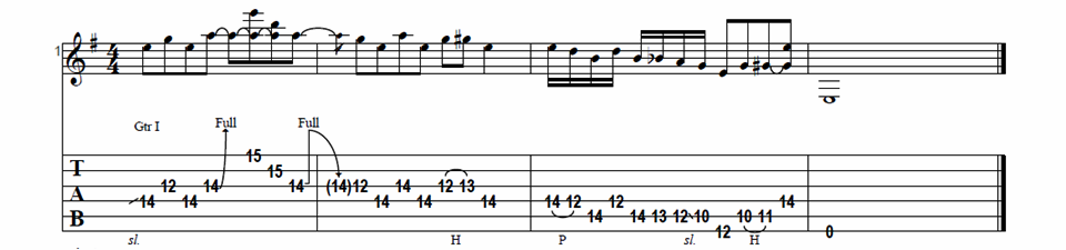 All right so the first one we’re going to look at is the riff from the song Mr. Speed. So this is the intro and then it’s also part of the chorus and it’s a cool kind of a bluesy little riff. So we’re gonna start off here playing this E5 chord, but we’re just playing up here, so I’m on the ninth fret of the D string and G string with my first finger… So we start off we hit this and this is on the and of four and then it’s tied to the downbeat of one of the next measure; so it’s like and one, and then on the and of one you hit it again. Then we’re going to take your third finger and put it on the 11th fret of the G string and you’re going to pick that and you’re going to slide from the 11th fret to the 13th fret and then take your second finger and drop it onto the 12th fret of the B string… Then we’re going to take that shape and move it down a whole step so now we’re at the 10th fret of the B string with my second finger and the 11th fret of the G string with my third finger and then follow that by barring at the ninth fret on the G and B string and then we’re just going to move that down a whole step and repeat basically the same thing; so now we’re barring the seventh fret of the D and the G strings and we’re going to go to the ninth fret of the G string and slide to the 11th fret and then drop our second finger here onto the 10th fret of the B string then move that down a whole step so your second finger ends up on the eighth fret of the B string and your third finger on the ninth fret of the G string and then ending it with your first finger barring the seventh fret of the G and the B strings… Then after that we’re going to come down to the second fret and you’re going to barre your first finger on the second fret of the D and the G strings and we’re gonna hit that twice and then take your third finger and barre it across the D and G string at the fourth fret and we’re gonna pick that and bend and release. So actually I skipped a whole part in there so we come down to the second fret barre your first finger across the D and G strings and then take your third finger and barre it across the D and G strings at the fourth fret and back to the second; so two, four, two, back to four and we’re gonna do a bend and release and then end on the second fret… Then we’re going to move that up a whole step and do the same thing so now we’re at the fourth and the sixth fret and then the whole thing would just repeat…
