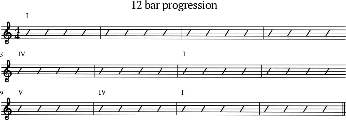 12 bar progression Notice the chord progression has the following structure: It starts off with 4 bars of the “I” chord, then it has 2 bars of the “IV” chord, followed by 2 more bars of the “I” chord…and then a bar of “V”, a bar of “IV”, and finally 2 more bars of the “I”.The actual chords, as we mentioned, are often dominant 7 chords, but they could be major chords, minor chords, or even a combination of different chord types. Here are a few examples: