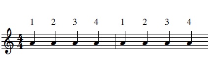 The 4/4 rhythm: This is the most common time signature in occidental (western) music. Technically, 4/4 means 4 notes to a bar, and the quarter note gets the beat, but in practical terms, you can just think of this as a “ONE TWO THREE FOUR” count.
