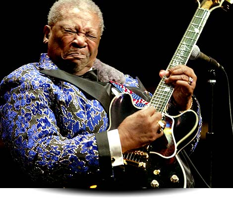 The only difference is that you would primarily be using minor chords or minor 7 chords. For example, a blues in Cm would use Cm, Fm, and Gm. Of course, there are endless variations. One popular maneuver is to play VI (Maj7) to V7 on bars 9 and 10. This change was made famous in B.B. King’s recording of “The Thrill is Gone”. In a Bm blues, those chords would be Gmaj7 to F#7, which we’ll see later on this page.
