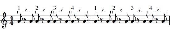 The Shuffle: This is similar to the triplet feel but the second note is removed, so that that the first note will last longer. This type of rhythm is extremely common. Sometimes it is called “swing feel.”