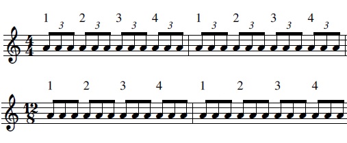 Triplet feels: This is one a common basis for the rhythms in blues. It’s basically like the 4/4 rhythm but divided into 3 notes per beat. This could also be seen as 12/8 and is often notated that way.