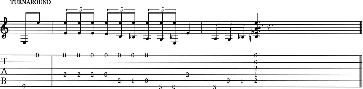And here is a third E blues turnaround. Notice this very cool idea: getting a fuller sound with wide intervals. As you study and learn more blues turnarounds and licks, notice how you can add open strings to fill out the sound, as well.
