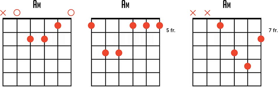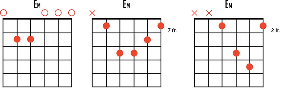 Next to major major chords, minor chords are the most common. They are built by a root, a minor 3rd, and a perfect 5th. The only difference between the minor chord and the major chord is the 3rd…and of course, we can find these in minor blues progressions. As discussed, there are many variations for minor blues progressions. This example in the key of A minor uses all minor chords: Minor Blues Chords And here are some of the specific chord voicings you can use for the Am, Dm, and Em chords: