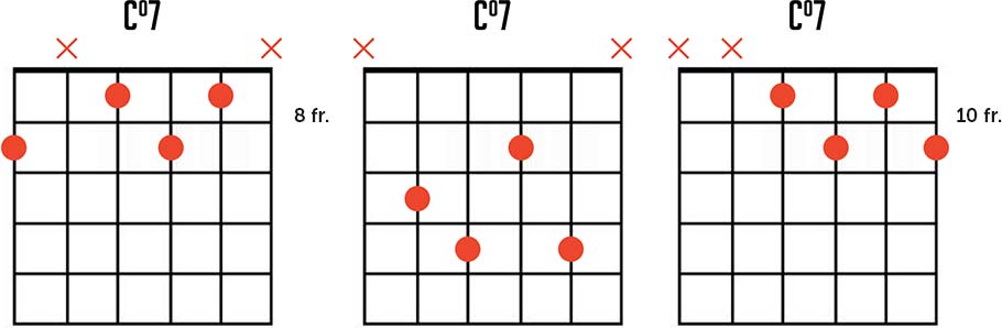 This is a more advanced chord that you can use either to substitute for dominant chords or as a passing chord. Try replacing a dominant 7th by a diminished 7th up a major 3rd. This will create a 7b9 sound. For example, for G7 play Bdim and you will get a G7b9 sound.