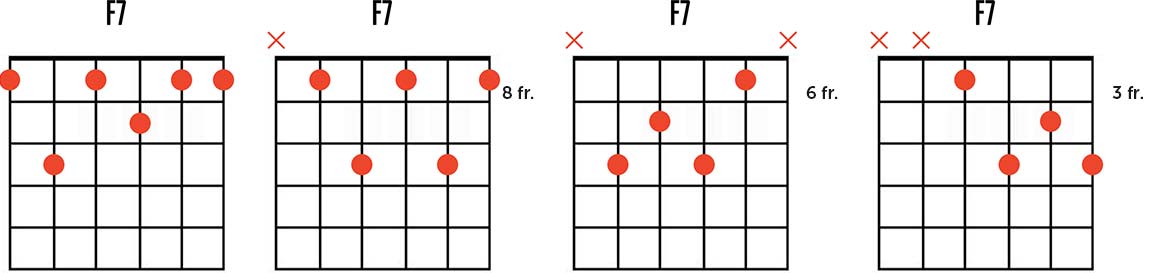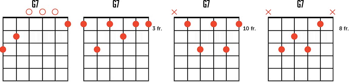 Dominant chords are another common chord type and you can usually substitute a dominant chord for a major chord in a major key song or in a “major blues” progression and are key to understanding how to play blues on guitar. This is because the dominant chord is built from a major triad with one extra note. In other words, they are built from the root, a major 3rd, a perfect 5th, and a minor 7th.Here’s what a blues in C would look like with dominant chords (sometimes called “seventh” chords) Dominant Seventh Blues Chords Here are some chord voicings you can use for the C7, F7, and G7 chords.