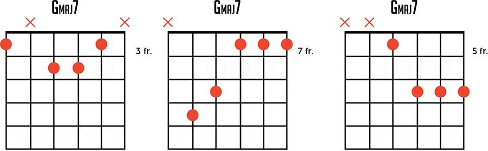 1. Major 7th chords: These are major chords with an added major 7th. So they have a root, a major 3rd, a perfect 5th, and major 7th.