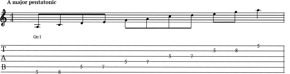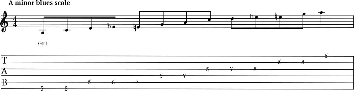 You could write a dozen books on all the various ways to use the scales, but in short: You can pretty much use the minor pentatonic scale anywhere, and you can use the major pentatonic scale over any major blues or major chord. A variation to the minor pentatonic scale is known as “the blues scale” and it simply adds one extra note, which is the b5 (flat fifth), sometimes called “the blue note”. This note can be added to licks as a passing note. Here is the A blues scale: