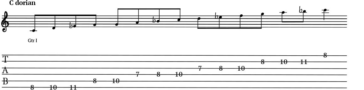 You can use many other scales in blues such as the natural major scale or the natural minor scale. You can also use the Dorian mode and the Mixolydian mode. The Dorian mode is a minor scale with a major 6th. A good way to see the structure and to understand from where it comes is to compare it to its parent scale. We don’t have time here to get into a complete discussion on modes, but the Dorian mode is the second inversion of the major scale, so if the “root scale” or “parent scale” is C major, then D Dorian has all the same notes but starts on the D.: