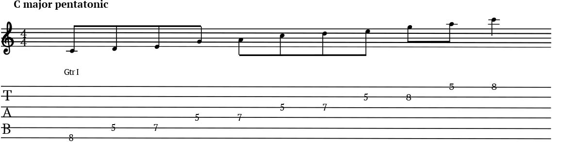 There are a few main scales that are used for playing the blues: These include the minor pentatonic scale, the major pentatonic scale, and the so-called “blues scale”.“Penta” is Latin for 5, and guess what, pentatonic are 5 note scales. Actually, there are many possible pentatonic scales, but the main one is often just called THE pentatonic scale, or more accurately: the minor pentatonic scale. The nice thing about pentatonic scales is how they overlap with the diatonic (major/minor) scales. For example, if you take a C major scale, and remove the 4th and 7th degrees, you’ll get a C major pentatonic scale.