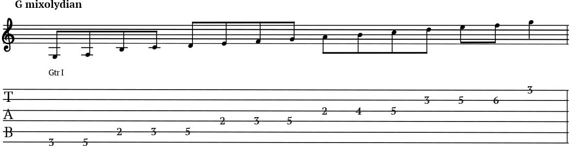 This scale is perfect for major blues progressions and especially for playing over dominant 7th chords because of that 7th interval we just talked about. Here’s the tab for the G Mixolydian scale.