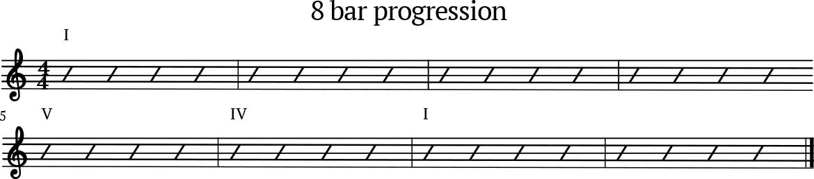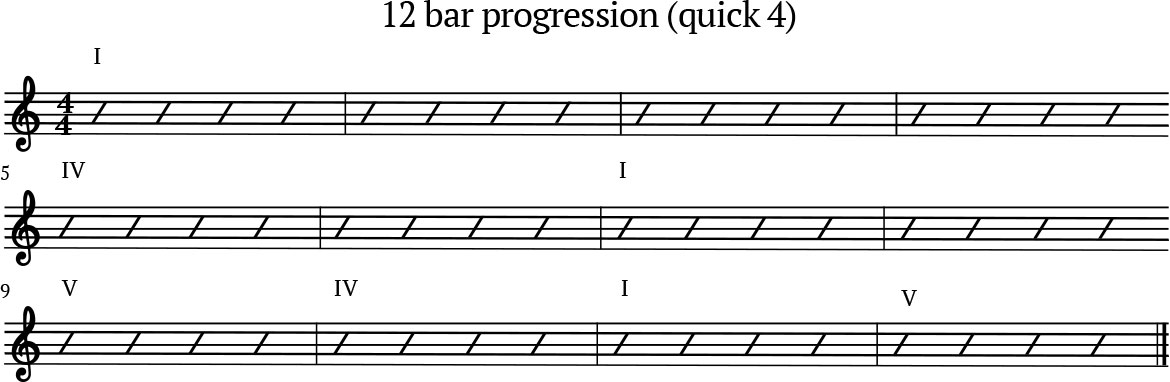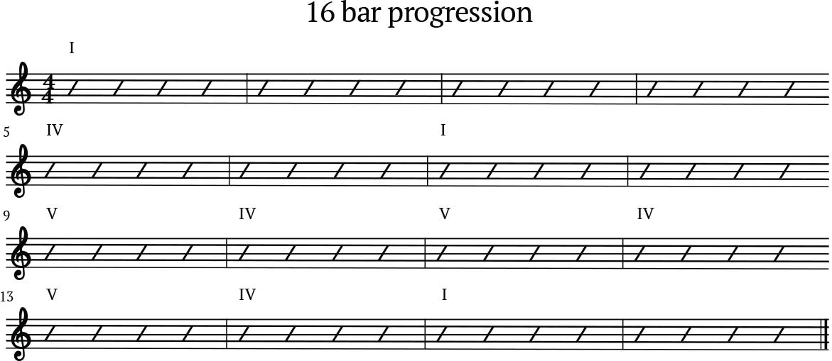 12 bar progression Notice the chord progression has the following structure: It starts off with 4 bars of the “I” chord, then it has 2 bars of the “IV” chord, followed by 2 more bars of the “I” chord…and then a bar of “V”, a bar of “IV”, and finally 2 more bars of the “I”.The actual chords, as we mentioned, are often dominant 7 chords, but they could be major chords, minor chords, or even a combination of different chord types. Here are a few examples: