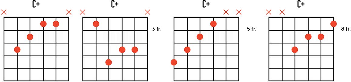 I’ll mention one more chord type: The augmented chord, which is a major chord with a raised fifth. In the key of C, this is sometimes notated as Caug or C+ : Augmented Guitar Chords