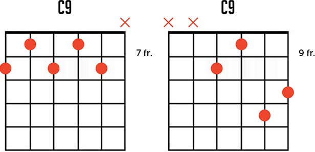 And here’s a couple of alternative chord voicings for the C Dom9 chord, which is usually just written as “C9”C9 Chord Chart