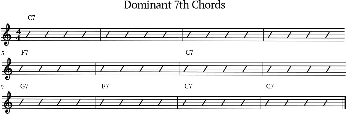 Dominant chords are another common chord type and you can usually substitute a dominant chord for a major chord in a major key song or in a “major blues” progression and are key to understanding how to play blues on guitar. This is because the dominant chord is built from a major triad with one extra note. In other words, they are built from the root, a major 3rd, a perfect 5th, and a minor 7th.Here’s what a blues in C would look like with dominant chords (sometimes called “seventh” chords) Dominant Seventh Blues Chords Here are some chord voicings you can use for the C7, F7, and G7 chords.
