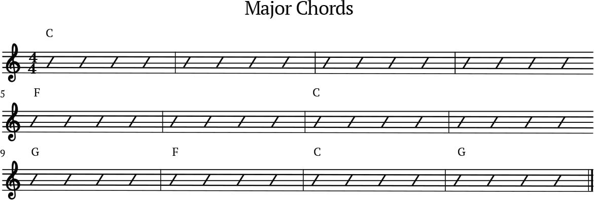 Major chords are the most commonly used chords of all. They are built from a root, a major 3rd, and a perfect 5th. You can play any basic “major” blues with these chords. Here’s an example of a blues in C major: major chords guitar Here are some specific chord shapes you can use for the C, the F, and the G: