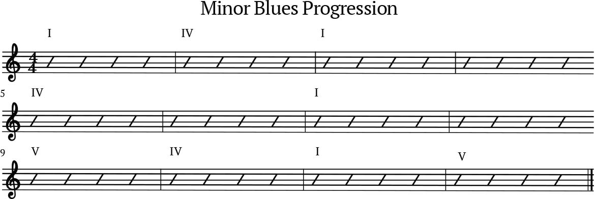 The minor blues structure is nearly the same as for “normal” blues or major or Dominant tonalities. Minor Blues progression